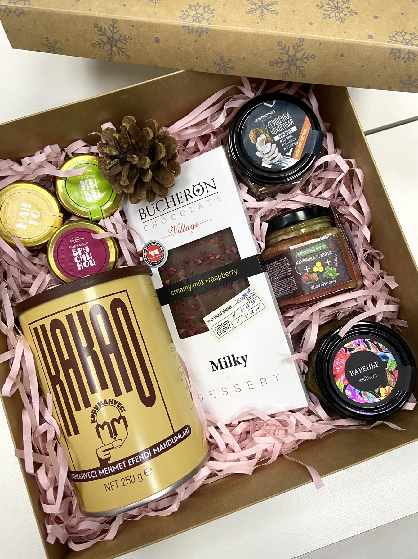 Варенье из фейхоа, кокосовая сгущенка, шоколад с малиной, крем-мёд клубника-мята, какао....