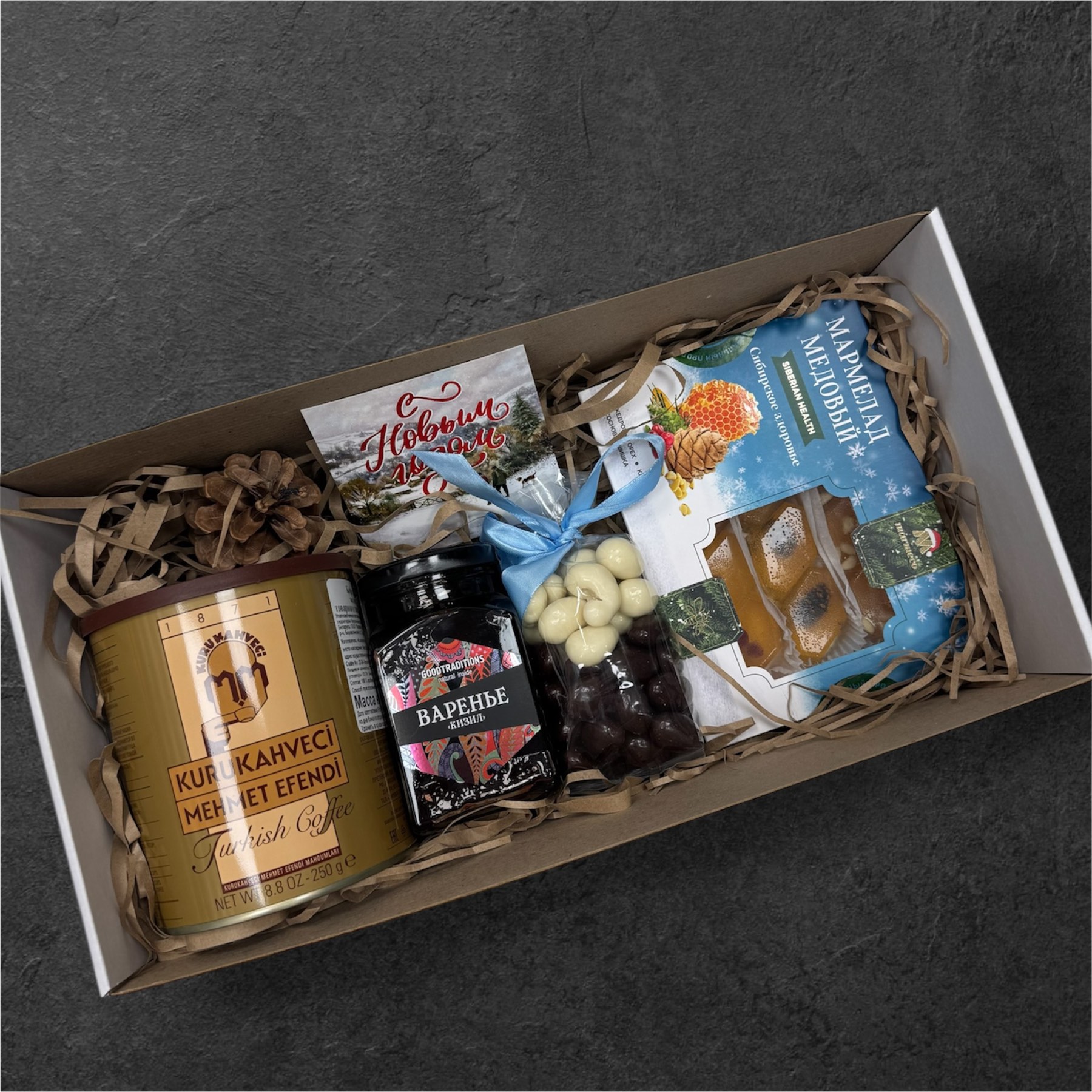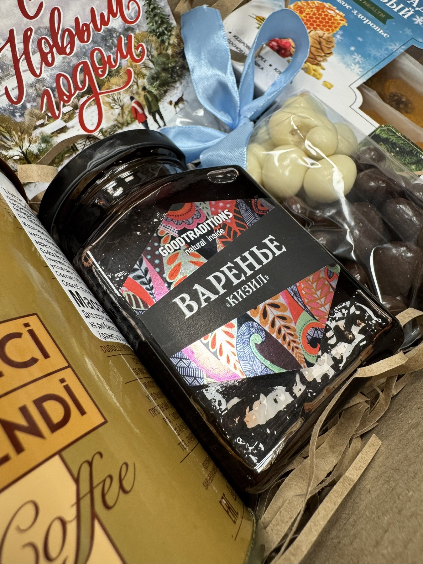 Медовый мармелад, варенье из кизила, кофе молотый, орехи в шоколаде