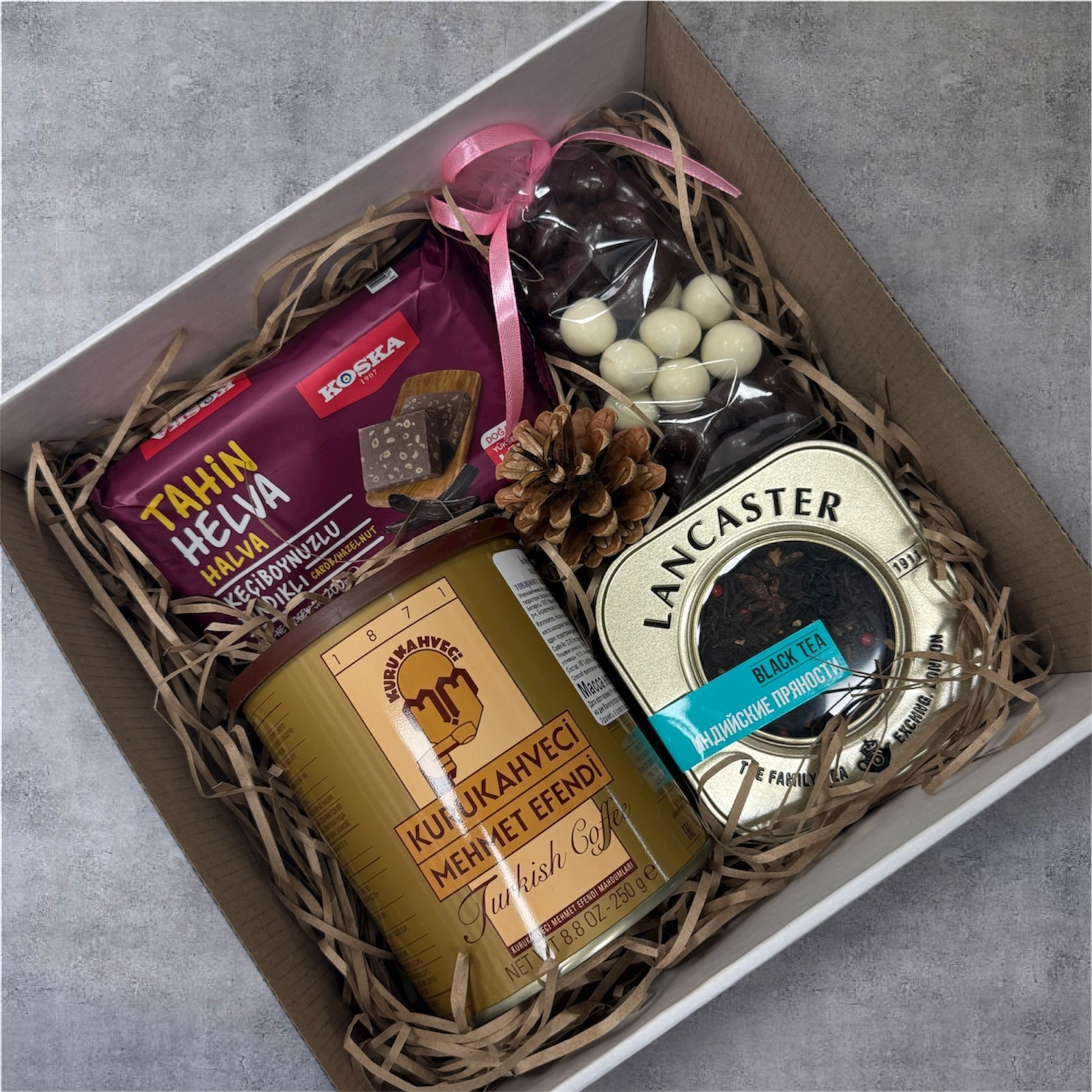 Подарочный набор для ценителей вкуса и уюта: ароматный турецкий кофе Mehmet Efendi, пряный индийский чай Lancaster, орехи в нежном белом и насыщенном темном шоколаде, а также восточная халва Koska с кэробом и фундуком.