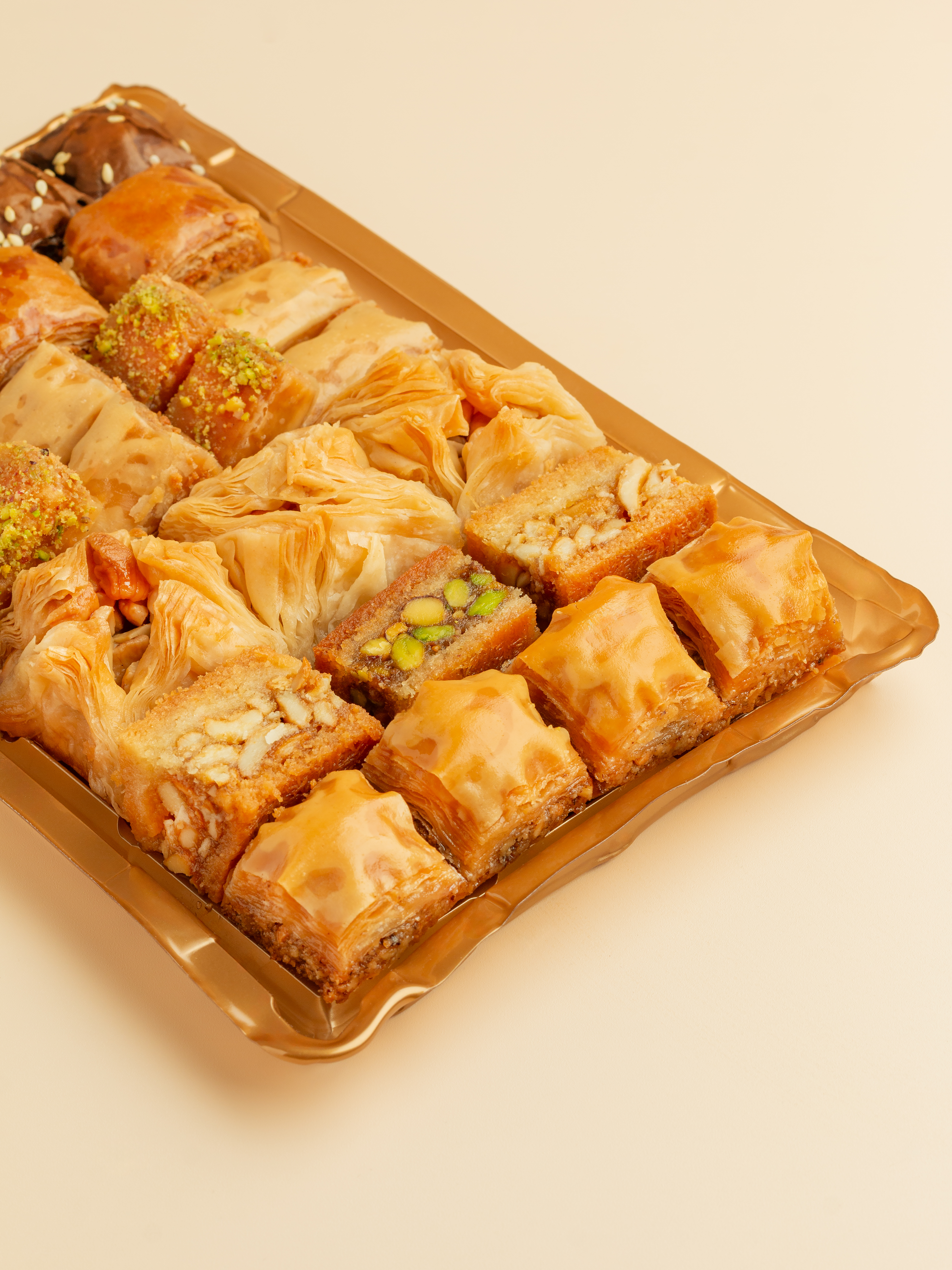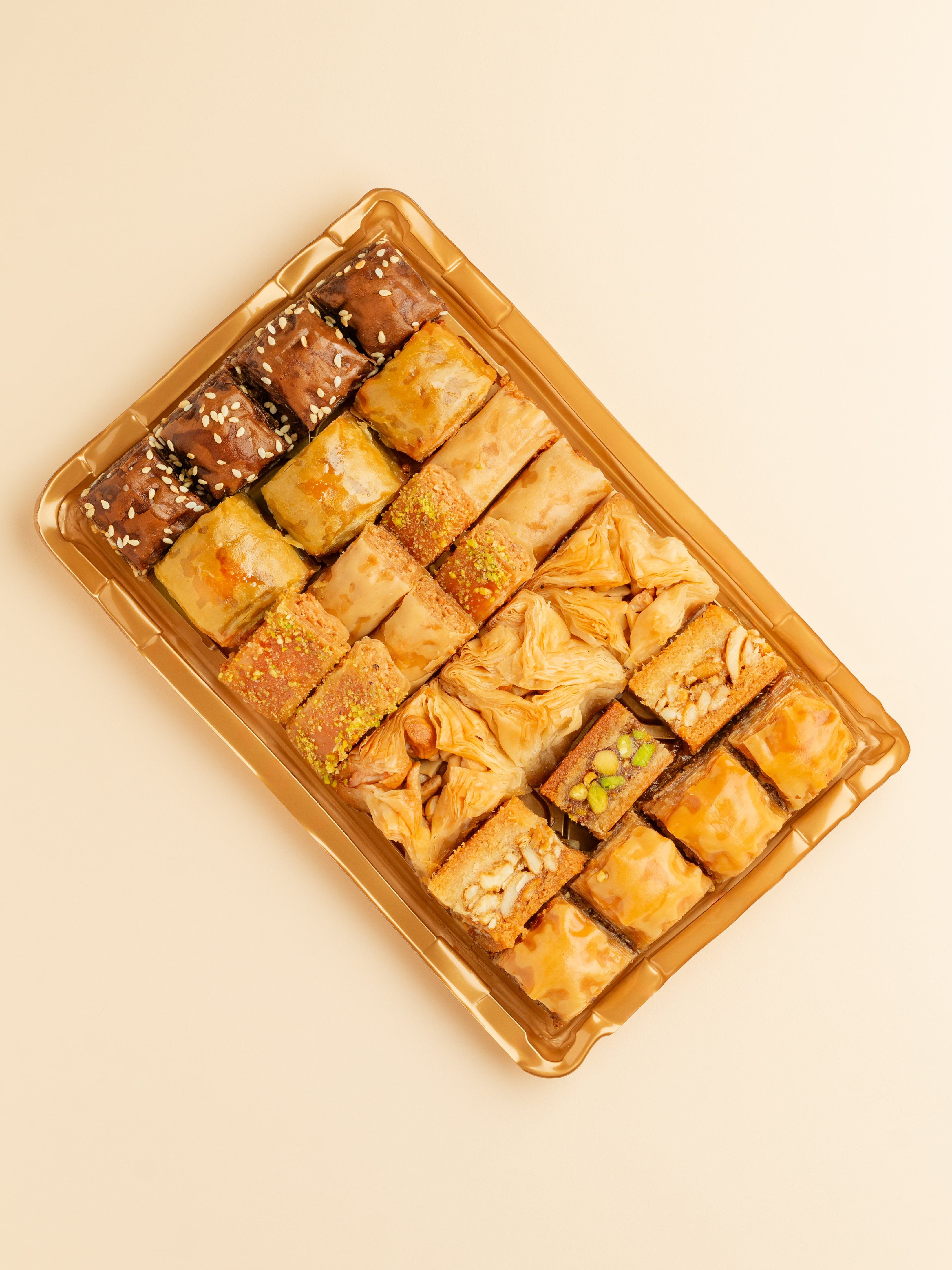 Состав ассорти: пальчики, баклава с фундуком, шоколадная баклава с фундуком, браслет, роза кешью, шоколадная роза кешью, ракушки.