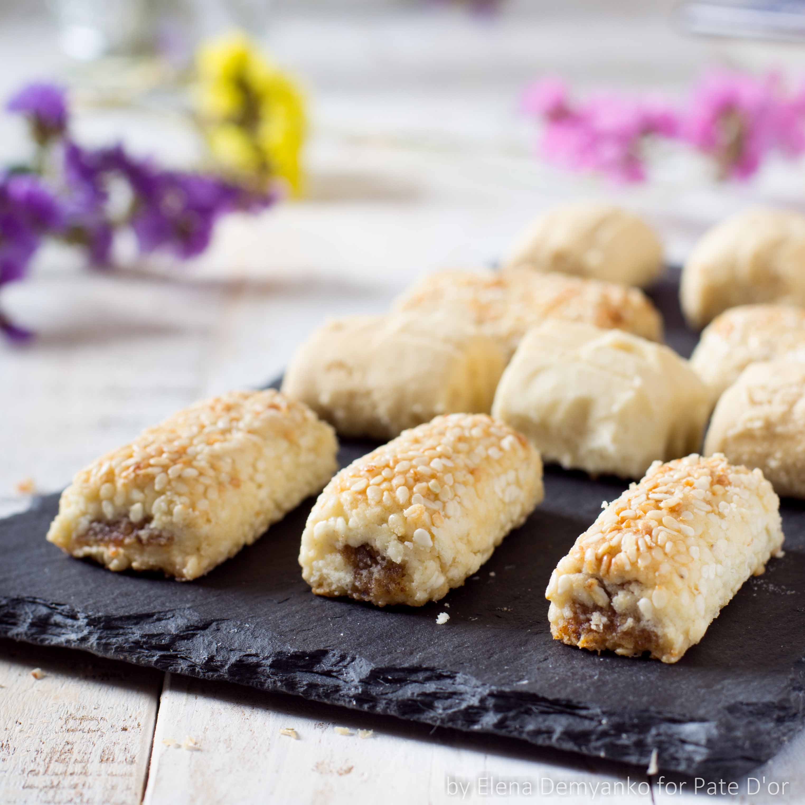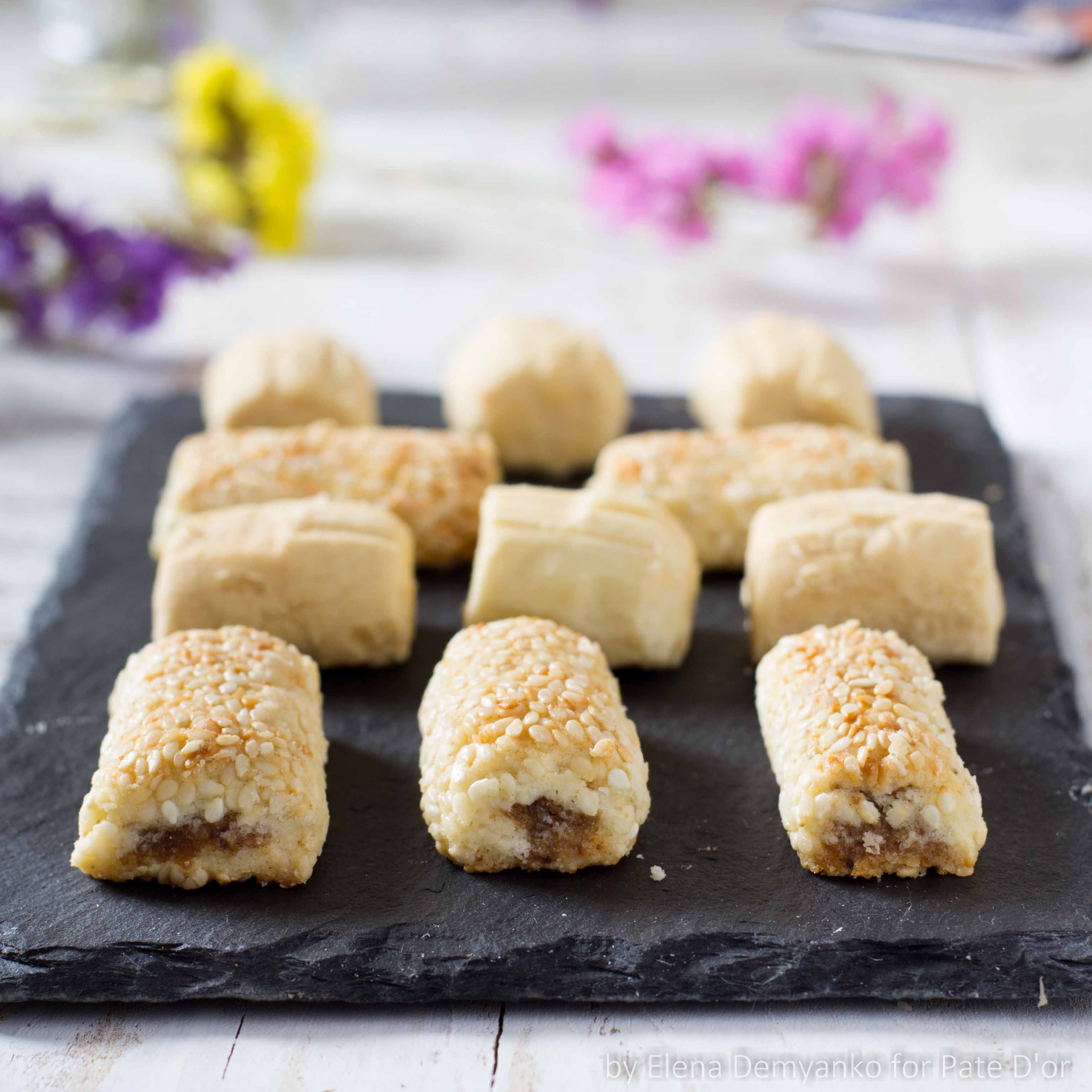 Начиненное финиками нежное песочное печенье, посыпанное кунжутом.