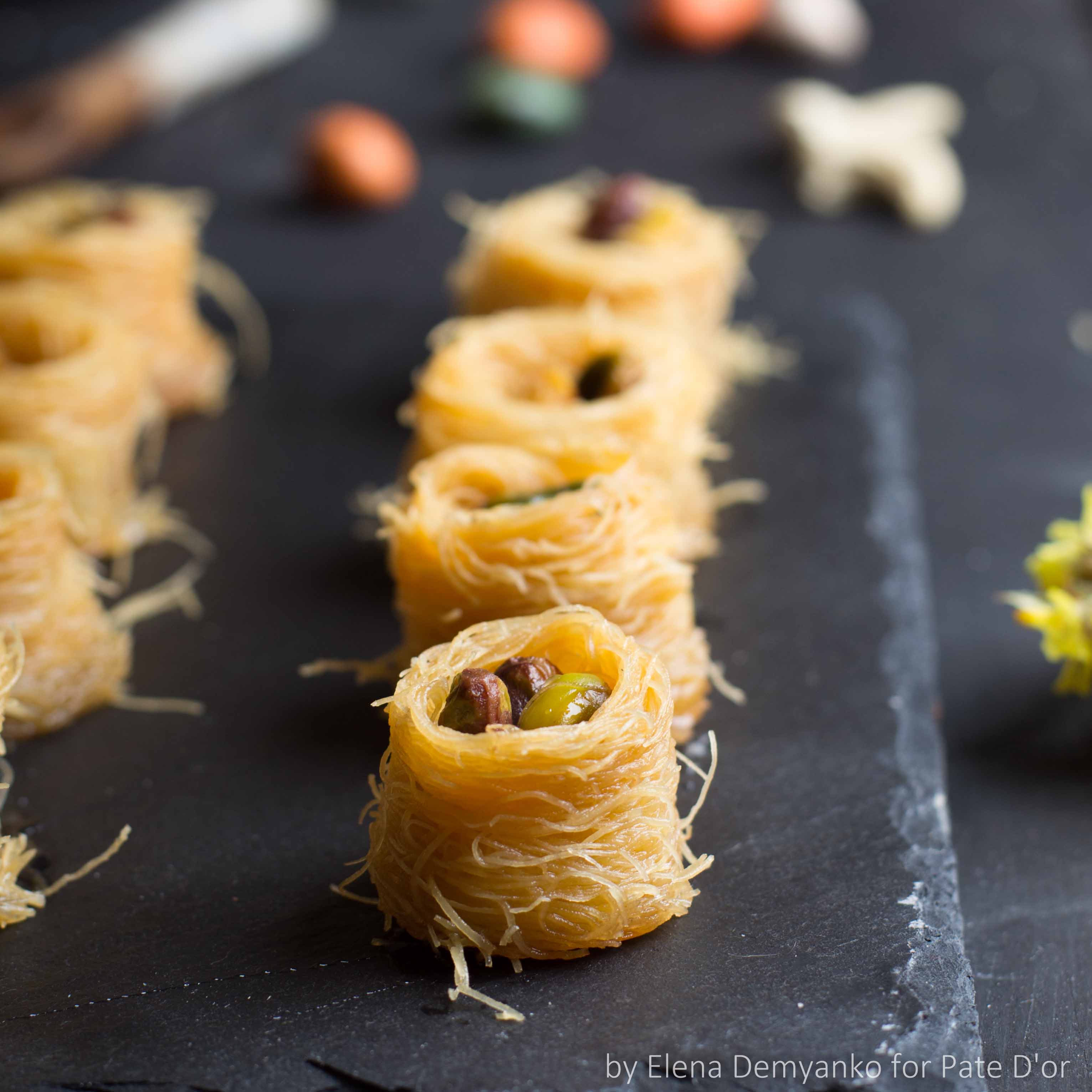 Сладость, выполненная в виде гнезда, из нитеобразного теста с начинкой из фисташек, пропитанных ароматным сахарным сиропом. Впервые увидев, невольно задаешься вопросом: как такое вообще можно сделать? Сладости, изготовленные из этого теста, напоминают что угодно, только не выпечку. Сплетение тонких нитей можно принять за гнездо невиданной птицы, за пучок высохших водорослей, за произведение рук скульптора-авангардиста, но, попробовав это невероятное лакомство, вы убеждаетесь, что это действительно шедевр, только не художественный, а кулинарный.
