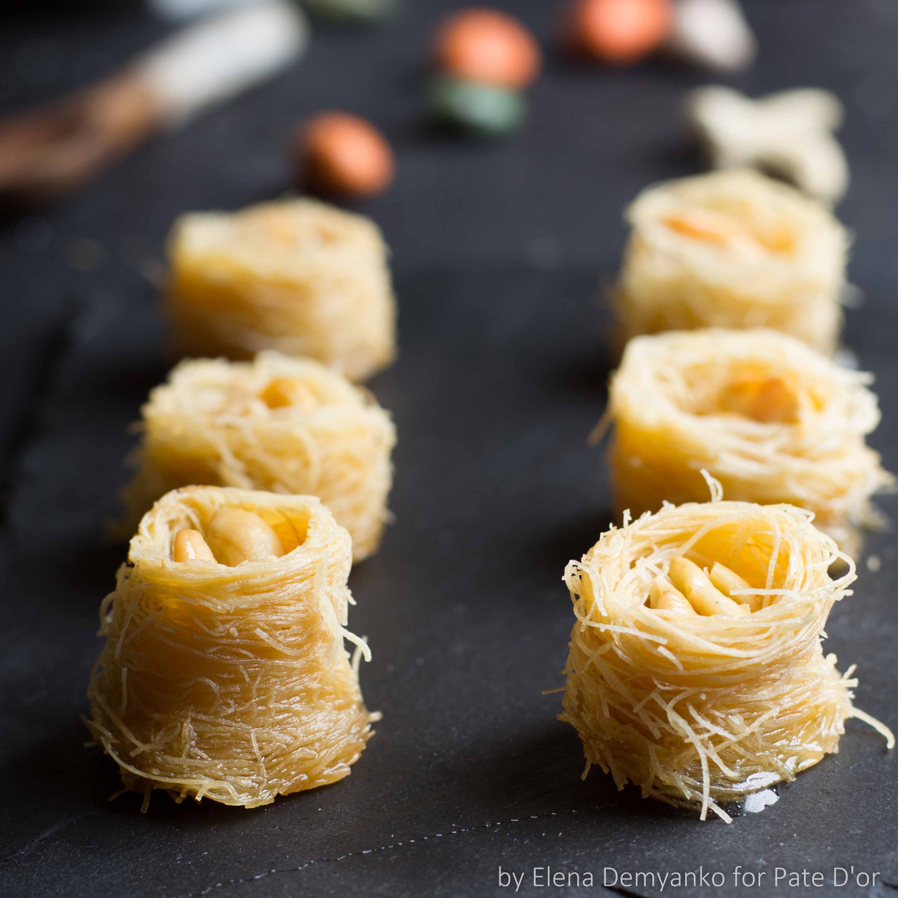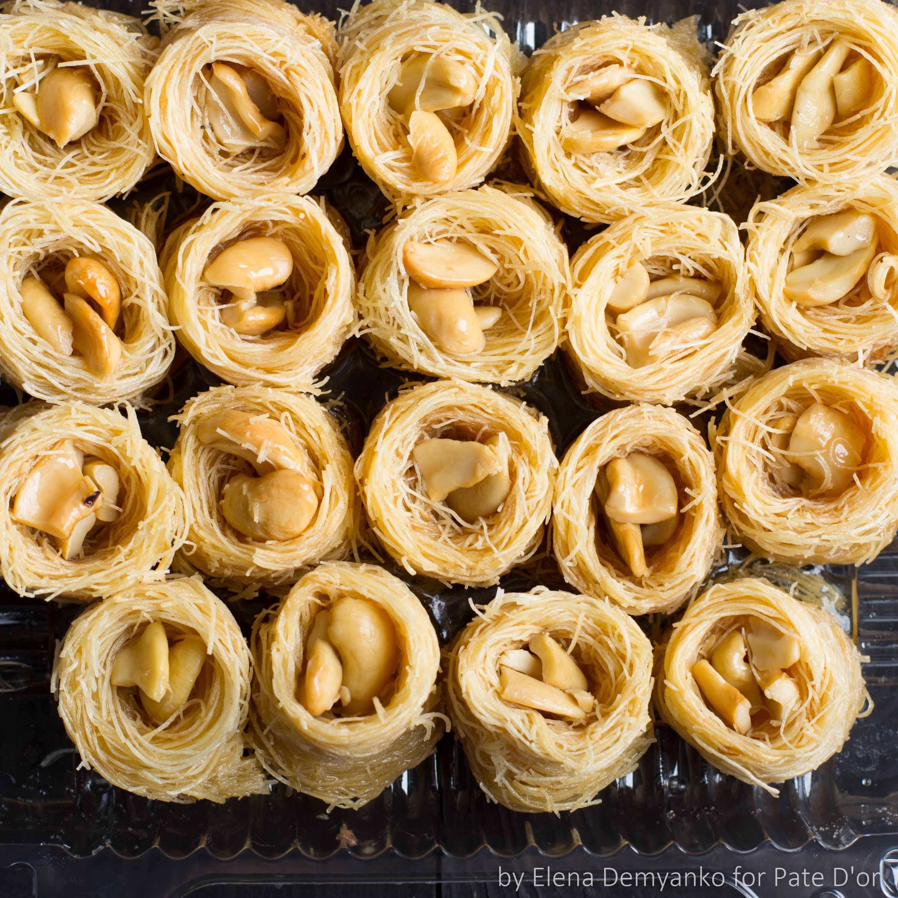 Сладость, выполненная в виде гнезда, из нитеобразного теста с начинкой из кешью, пропитанных ароматным сахарным сиропом.