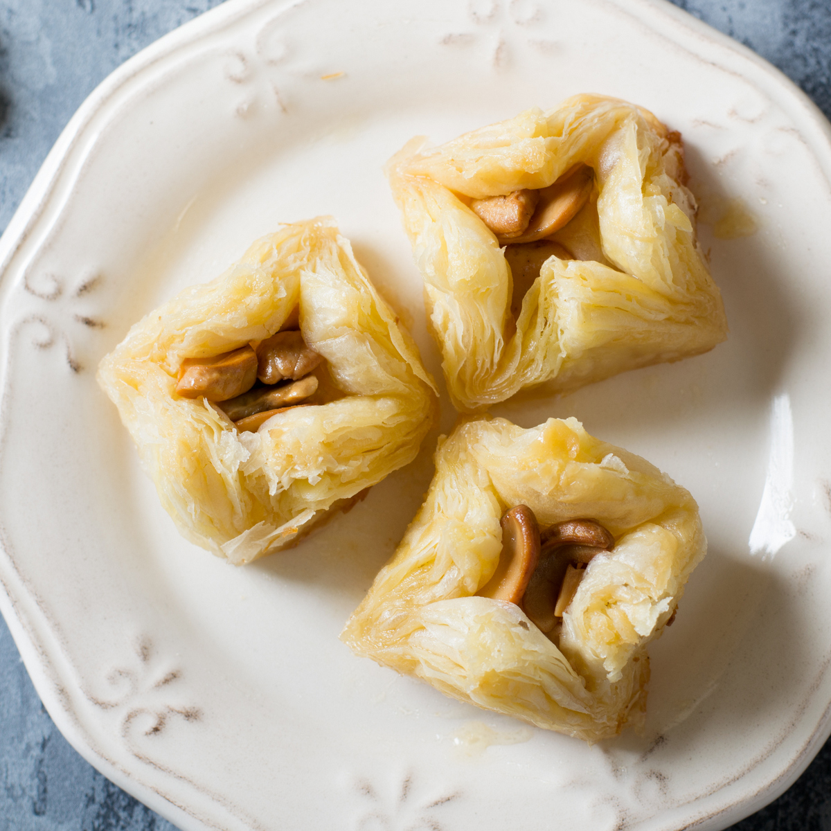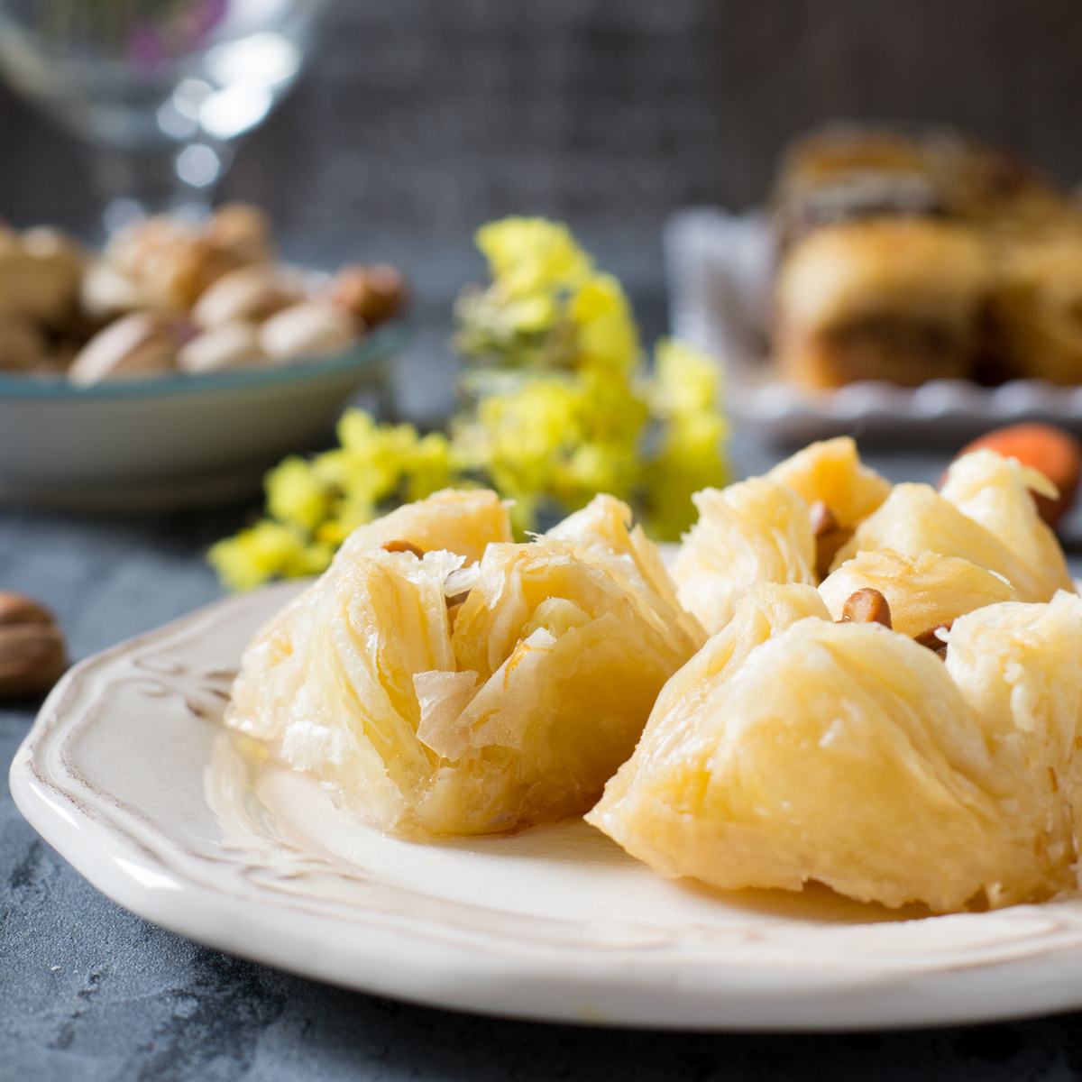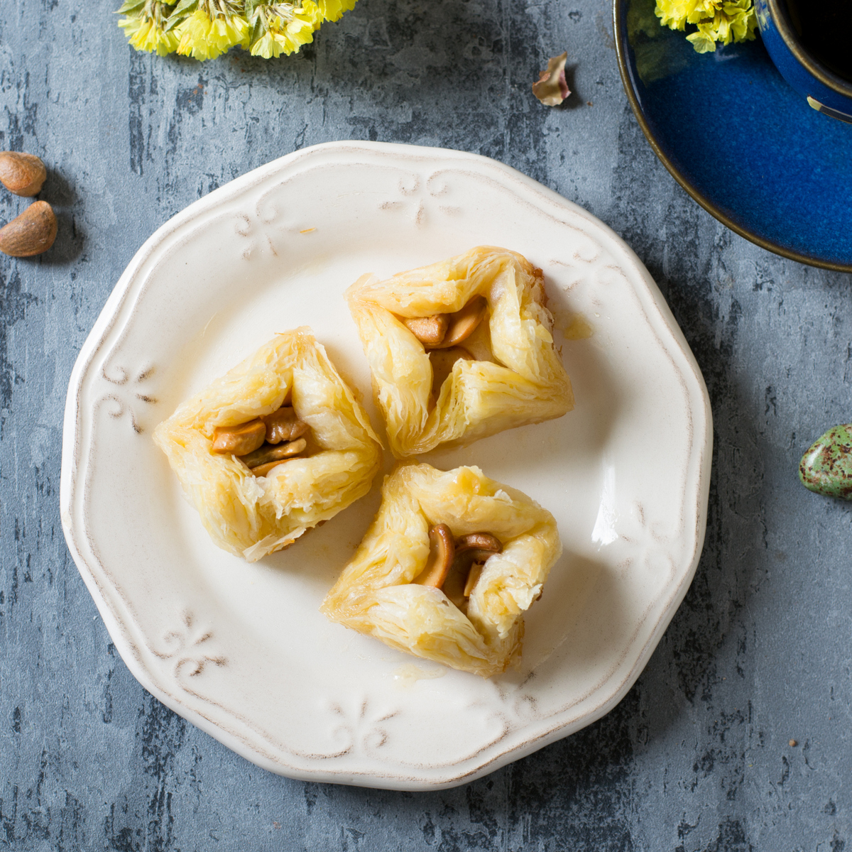 Готовится из легкого, практически невесомого тесто фило в форме конвертика с начинкой из фисташек и пропиткой из патоки.
