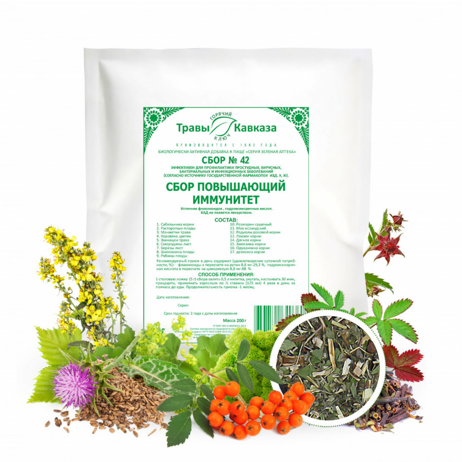 Действие сбора трав №42 направлено на укрепление иммунной системы и повышение защитных сил организма. Он эффективен для профилактики и лечения простудных, вирусных, бактериальных и инфекционных заболеваний, а также способствует восстановлению после болезни.