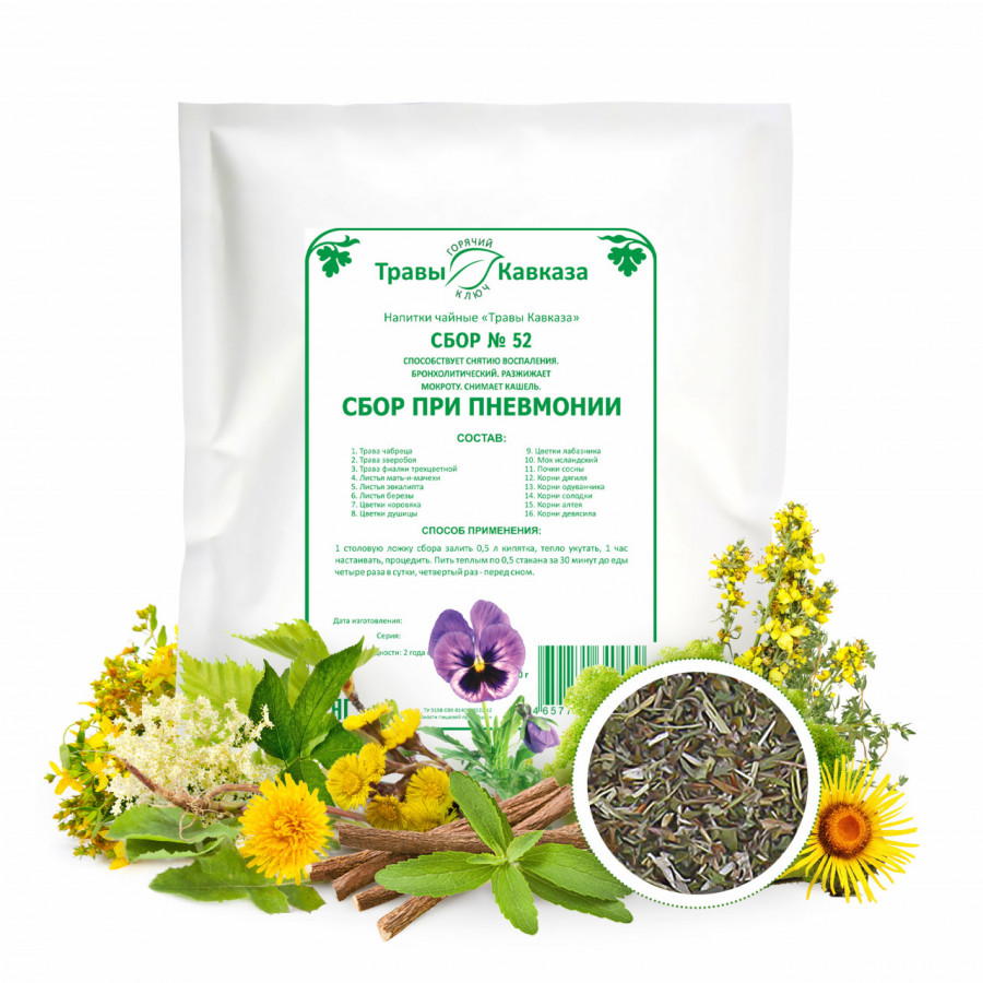 Сбор трав №52 очень эффективен для лечения воспалительных процессов в бронхолегочной системе. Этот грудной сбор из 16 лекарственных растений помогает в снятии воспаления, обладает бронхолитическим действием, разжижает мокроту и способствует облегчению кашля. Рекомендуется в восстановительный период после антибиотиков и при хронических заболеваниях дыхательных путей.