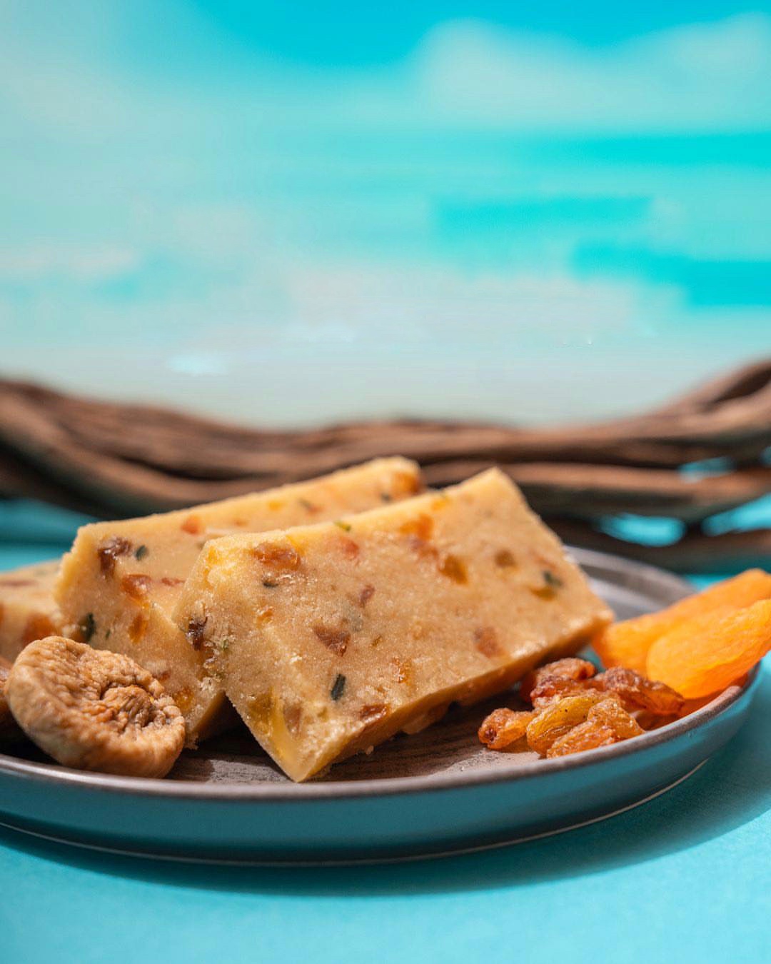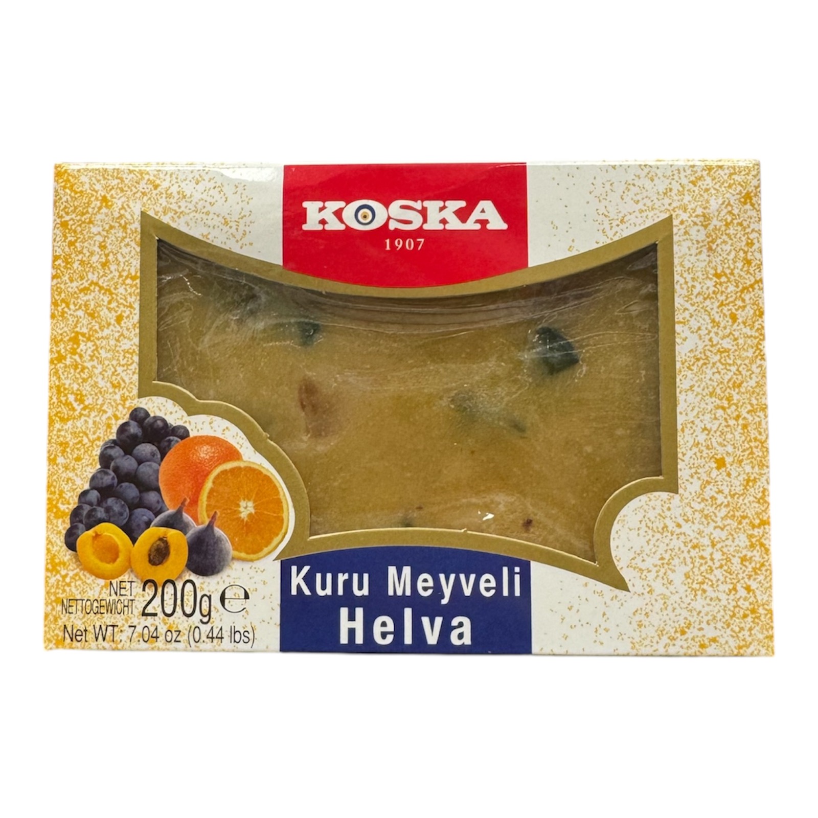 Состав: Сахар, манная крупа (пшеница), кунжутная паста, сухофрукты 7% (курага, изюм, сушёная и засахаренная айва, апельсин, инжир), вода, растительное масло (кукурузное), гл.козный сироп, регулятор кислотности (лимонная кислота).